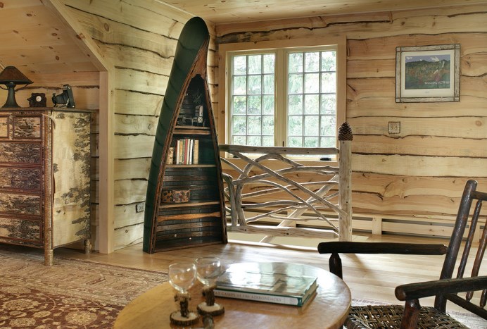 В интерьере загородного дома деревянного декора может быть много, поскольку он соответствует общей эко-стилистике. Шишки, коряги, прутья, пеньки — в идеале у каждого предмета должно быть свое предназначение. Так, в этом американском доме старая деревянная лодка стала шкафом и главной изюминкой гостиной в рустикальном стиле. Контраст «белый сосновый фон — темный мореный декор» всегда успешно работает.