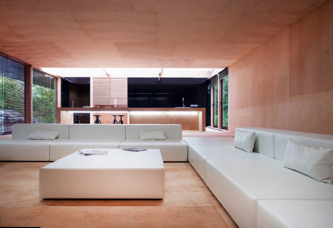 В деревянном доме на фото использованы клееные панели из фанеры 12 и 6 мм, покрытые лаком светло-розового оттенка под канадский кедр. Другой отделочный материал в проекте — черное каленое стекло — работает на контрасте со светлым деревом, но остается все в той же минималистичной обойме. Завершает эту игру белый кожаный диван современных прямоугольных очертаний.