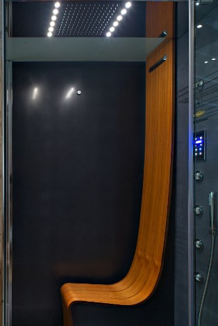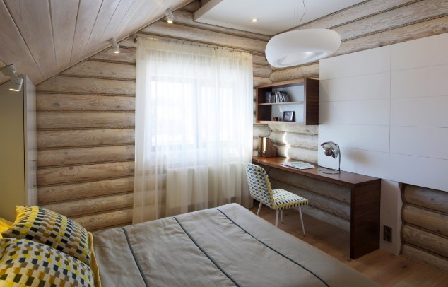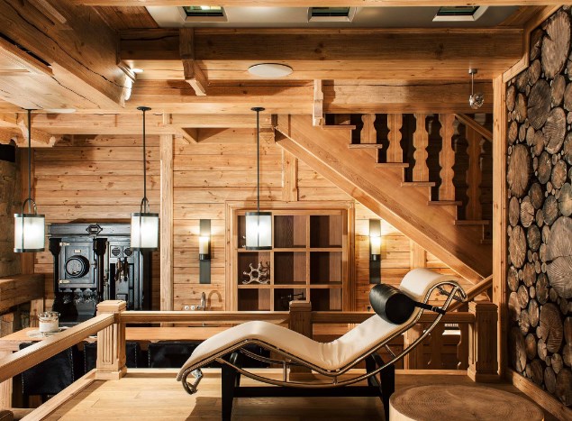 Если вы уже рассматриваете эту симпатичную кушетку, реплику раскрученной модели Ле Корбюзье, то, во избежание зависти, не сморите выше — над креслом расположен потолочный солярий на дистанционном управлении. Смотрите вправо — там демонстрируется интересный способ отделки деревянного дома внутри своими руками. Стена украшена спилами бревен: очень просто, и при том эффектно.