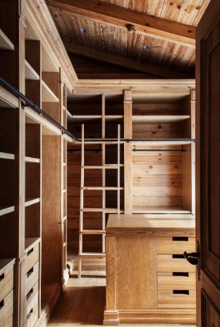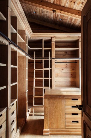 Интересный вариант для деревянного интерьера — сделать открытые шкафы без задних стенок. Зачем скрывать красоту натурального дерева? Напротив, ее можно подчеркнуть при помощи встроенной в шкаф подсветки.