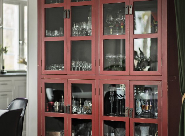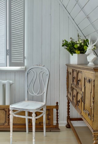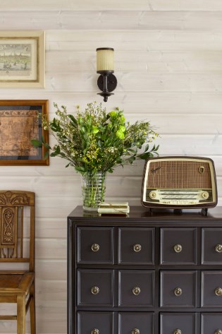 Если отделка деревянных стен выполнена в светлой палитре, акцентной деталью может стать любой предмет мебели — например, диван или шкаф, как на этой старой вилле в пригороде Стокгольма. Хозяйка просто пошила подходящие чехлы на икеевскую мягкую мебель, а китайский буфет оттенка красной ржавчины даже не пришлось перекрашивать (хотя и это было бы не сложно).