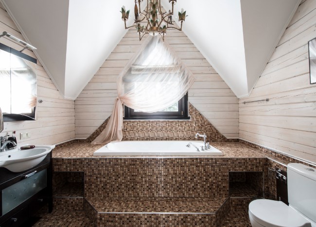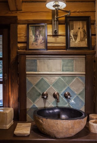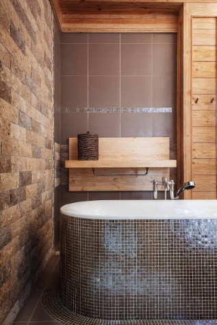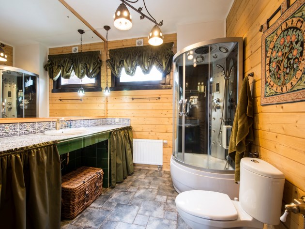 Отделка ванной в деревянном доме (на фото) — особый вопрос. Кто-то боится сырости и грибка, отказываясь от древесины в пользу плитки, а кто-то ищет качественные антисептики и лаки, чтобы сохранить очарование альпийской хижины (домика в стиле прованс или русской избы). Обратите внимание, как отделан «экран» под чашей ванны. Брутальные деревянные дверцы с «коваными» петлями открывают доступ к трубам.