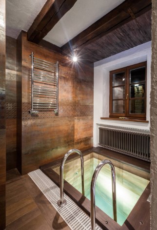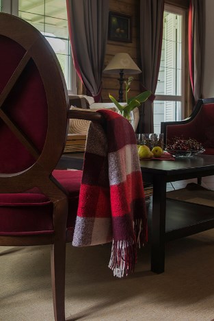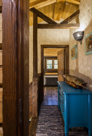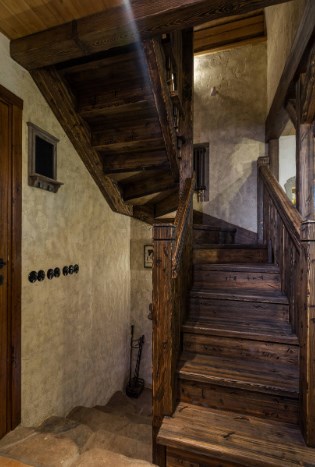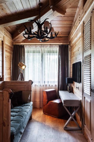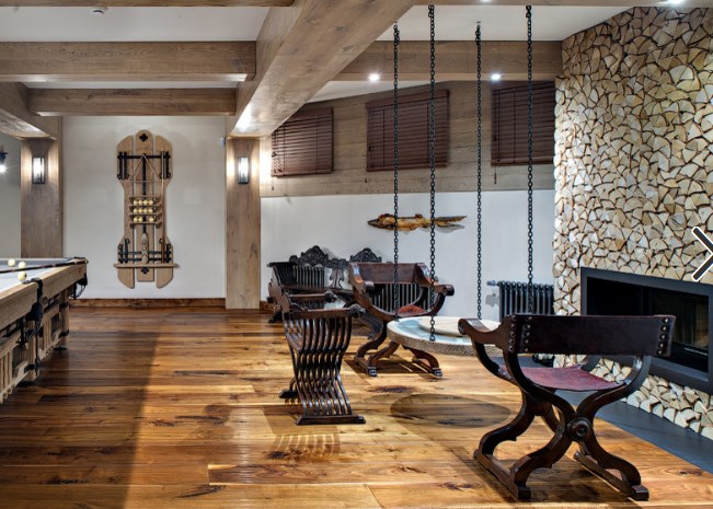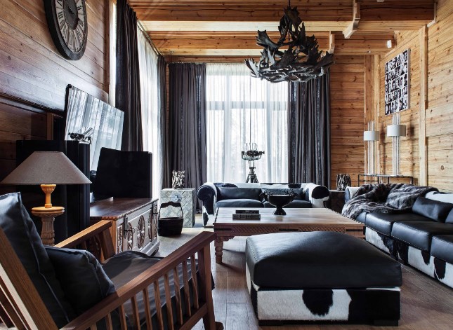 Базовая формула стиля шале: дерево+камень. Оба этих компонента не должны создавать ощущения новодела, поэтому камень выбирают неброских тонов, а древесину старят, морят, тонируют и патинируют. Ярко окрашенных деталей в альпийском стиле вы не найдете, все оттенки здесь приглушенные, мягкие. Разнообразить ассортимент материалов можно при помощи любых натуральных «ингредиентов» все той же древесной гаммы. Это может быть черный металл, лен, кожа, рога и т.п. Те же пуфы можно оббить бычьей шкурой — смотреться будет дорого и тепло (на вегетарианцев не действует).