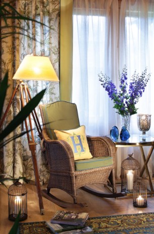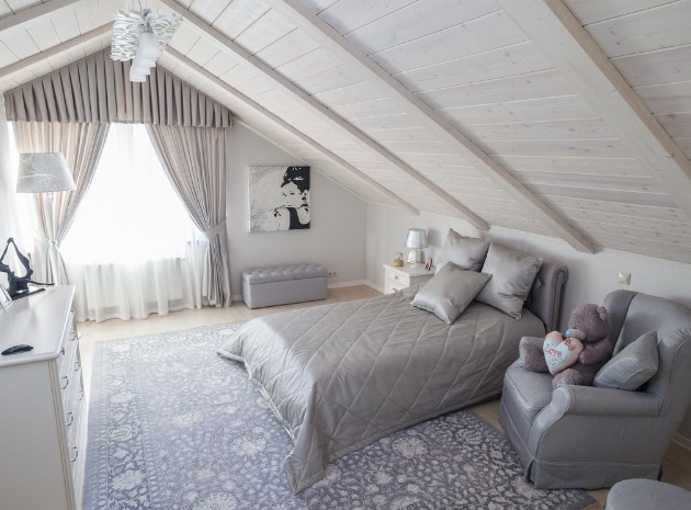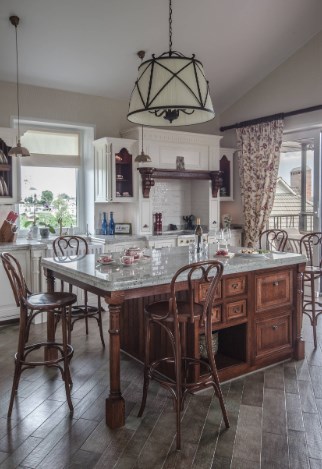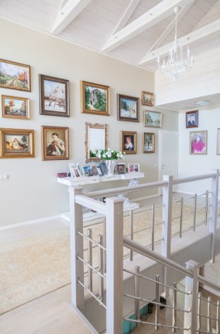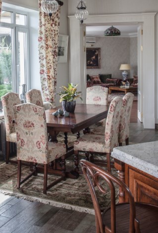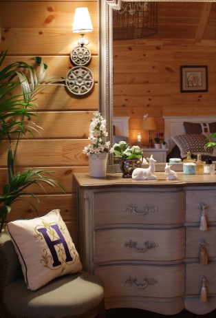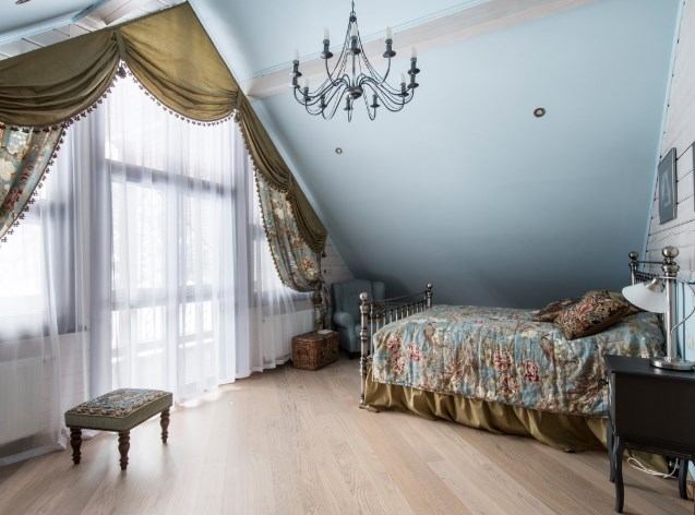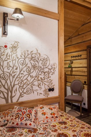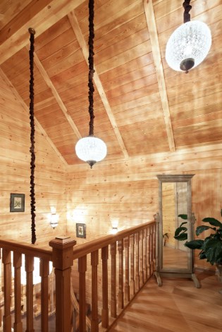 В этом жилище на Истре хозяйка очень хотела сохранить цвет и текстуру ангарской сосны, поэтому отделка стен деревянного дома превратилась в точечную работу по созданию уюта. Светильники и подсвечники в виде птичьих клеток, плетеная мебель, живые цветы и растительные орнаменты намекают на французское кантри. А в спальне дочери массивность отделки деревянного дома уравновешивает воздушный балдахин над кроватью.
