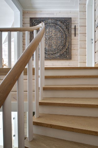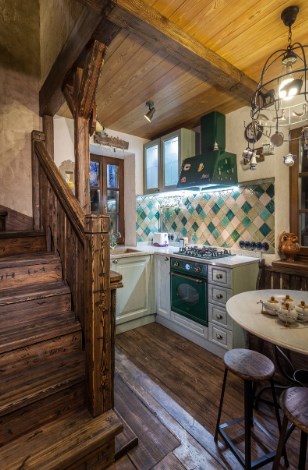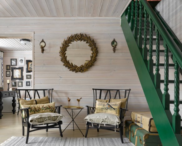 Отделка деревом внутри дома не может не учитывать его габариты. Маленькие пространства естественный оттенок дерева может сделать еще теснее, поэтому его лучше тонировать в полупрозрачный белый: так и древесный рисунок сохранится, и помещение будет выглядеть просторнее. Выбеленный фон позволяет использовать крупные яркие детали, но лучше, чтобы акцентный цвет был один, а деталей — немного, иначе они начнут спорить между собой. В проекте на фото такой деталью стала зеленая лестница, под которой хранятся винтажные чемоданы.