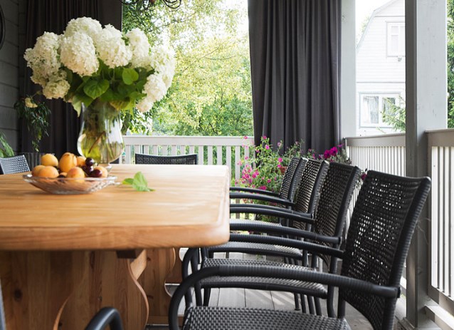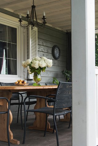 Беспроигрышный стиль для отделки деревянного дома — прованс. А беспроигрышный прием для прованса — кованая мебель. Она не переспорит деревянной обшивки, какой бы цвет для стен вы ни выбрали.