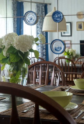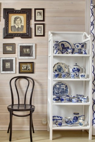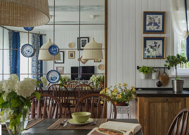 Чтобы добавить помещению света и объема, одна из стен в этом проекте отделана зеркальными панелями. Сохранить ретро-стиль интерьера помогла сине-белая гжель на стыках. Для дома в современном стиле этот прием был бы на грани китча, а в деревянном стена с расписными тарелками смотрится очень органично.