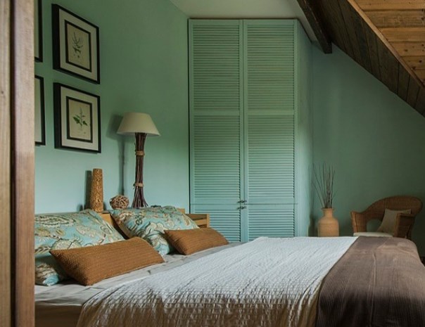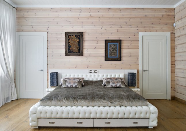 Стена деревянного дома даже в «голом» виде имеет свой цвет и характер — не всегда ее стоит дополнительно декорировать. Если же оттенок натурального дерева вам не очень нравится, но при этом хочется максимально сохранить исходящие от него покой и тепло, избегайте «чистых» цветов и навязчивых контрастов. В проекте на фото дизайнер обошлась всего двумя пастельными оттенками.