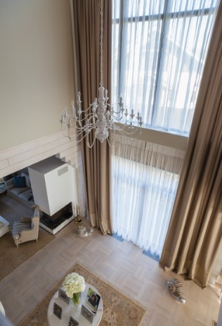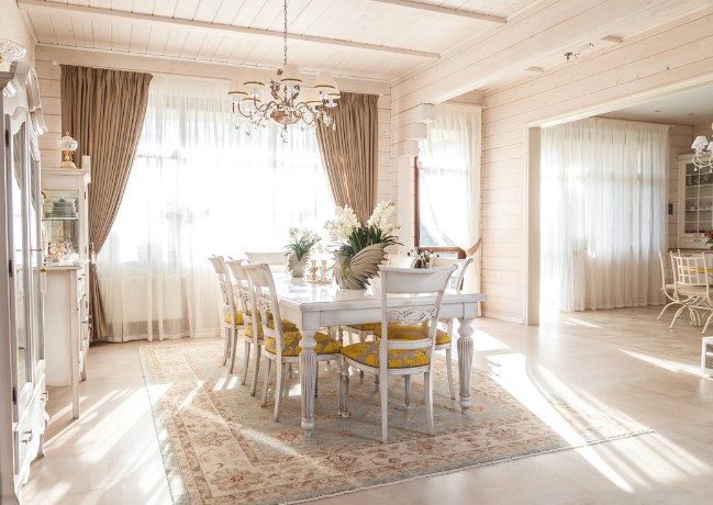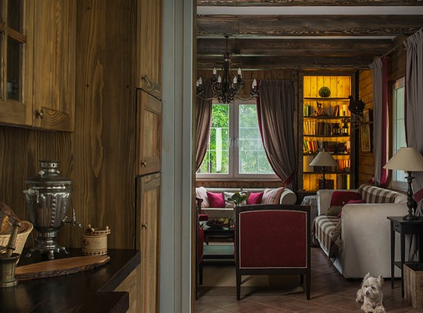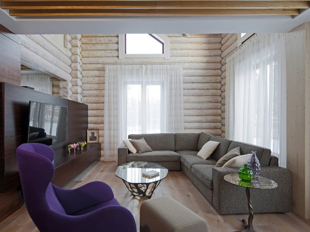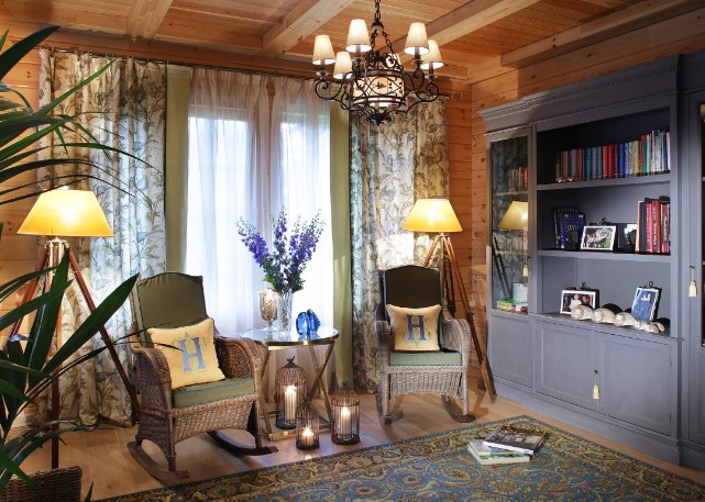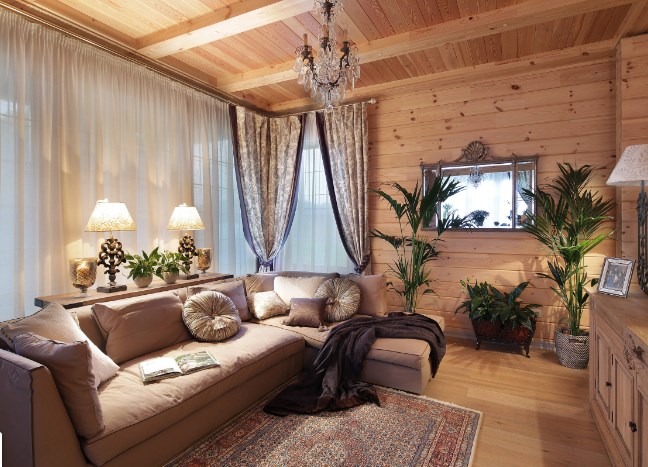 Гостиная в загородном доме — место притяжения всего живого. Чем просторнее она будет выглядеть, тем лучше. Если дом невысокий, лучше сделать центральную зону (холл, гостиную) под потолок, пожертвовав частью второго уровня, зато вы получите объем и в два раза больше света от фасадных окон. Еще больше вытянуть помещение помогут длинные, на два оконных проема сразу, шторы. Хотя о высоте гостиной лучше, конечно, подумать не во время отделки своего деревянного дома, а на стадии проектирования.