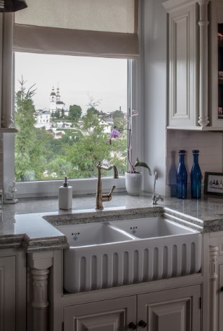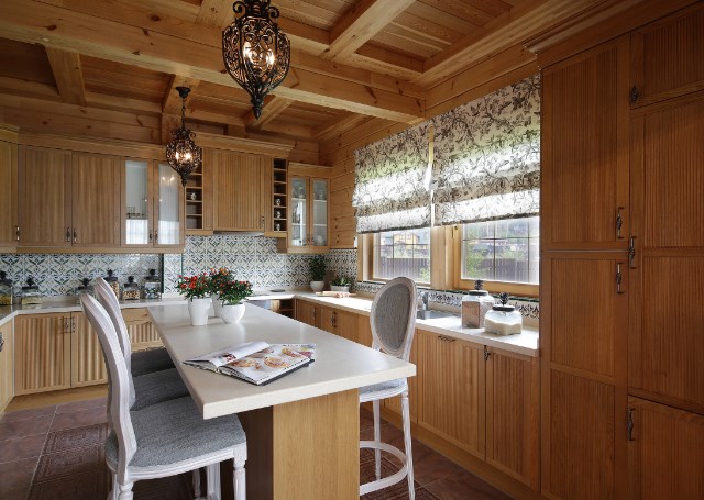 Отделка деревянного дома своими руками имеет понятные ограничения: многие «квартирные» приемы для декорирования здесь становятся визуальным шумом. К счастью, есть изразцы — то, что в тесной квартире выглядит слишком навязчивым решением для отделки камина, тут оказывается как нельзя к месту. Если вы хотите сделать очаг композиционным центром помещения, используйте изразцы или плитку под изразцы, как в этом проекте. Зону вокруг камина (и кухонный фартук) можно выделить майоликой с цветочным орнаментом.