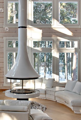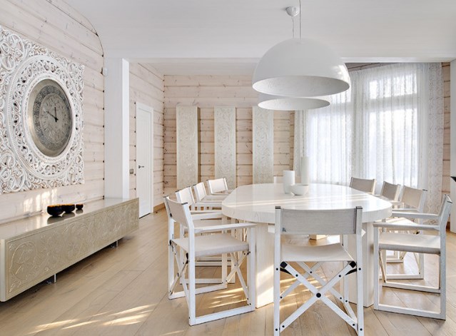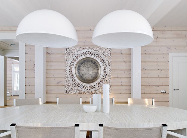Деревянный дом на фото принадлежит семье из Красногорска. Хозяевам нравилась обшивка из натуральной древесины, но не хватало изящества и легкости в интерьере. Тогда дизайнеры предложили дополнить древесную гамму в гостиной сложными светлыми оттенками (их еще называют оттенками белого цвета) в мебели, текстиле и изразцах. Сливки, топленое молоко, слоновая кость, арктический снег — все эти оттенки прекрасно уживаются с деревянными стенами, делая интерьер воздушнее. Да и современнее, чего уж там.
