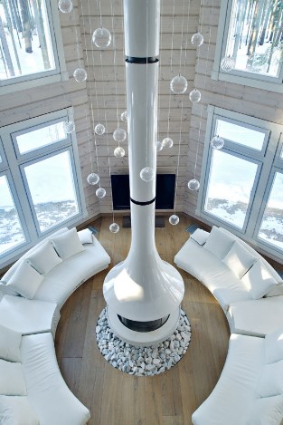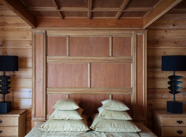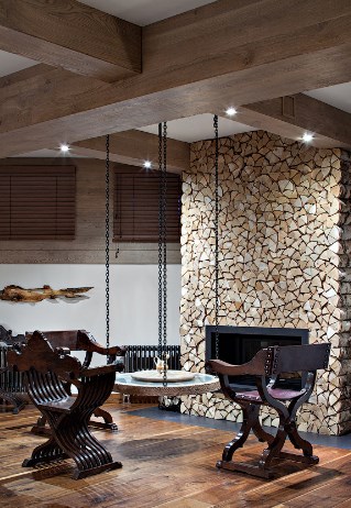 Еще одна интересная идея из этого проекта — украшение каминного портала поленницей в металлическом каркасе. Создание такой инсталляции потребует не только дров, но и терпения — все поленья подогнаны одно к другому и вручную закреплены. А кто сказал, что отделка деревянного дома внутри своими руками — это просто?
