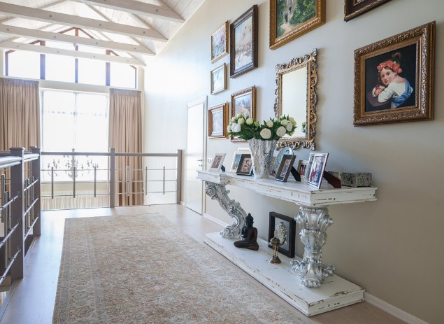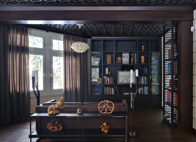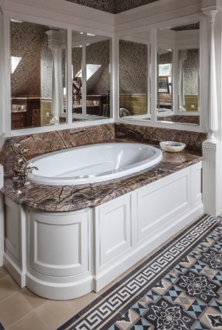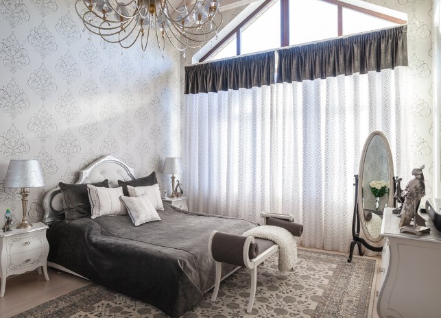Если интерьер не хочется перегружать яркими деталями и важно сохранить «ощущение шепота», можно использовать объемный декор в той же цветовой гамме, что и стена — например, ажурную резьбу. Кружевная рама на фото обрамляет большие часы. В этом же проекте кабинет и спальню украшают резные потолки.