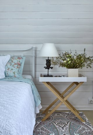 Кованая кровать необязательно должна быть кованая — это довольно дорого. Черное изголовье, «заигрывающее» с настольной лампой на фото — очередная иллюзия. Оно просто нарисовано на стене. В другой комнате этого дома в изголовье кровати выросло сказочное дерево. К разговору о том, что вы можете сделать при отделке деревянного дома внутри своей рукой.