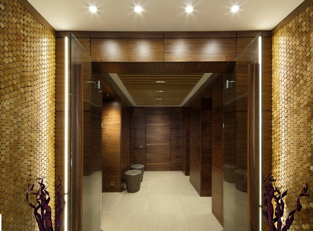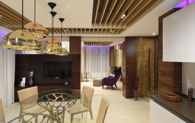 Чтобы не занижать потолки, вместо гипсокартона есть смысл использовать реечную обрешетку. Проводку можно пустить в пазах, а светильники встроить между подвесными рейками. Выглядит такой потолок не только симпатично, но и объемно. В этом проекте использованы 10-сантиметровые рейки.