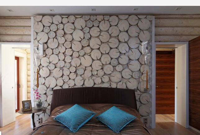 Винные пробки — еще один подходящий материал для отделки стены деревянного дома. Режьте каждую пробку на две половинки и обклеивайте ими выделенный простенок. Так ваша коллекция окажется у всех на глазах, а комната получит дополнительную порцию тепла и объема.