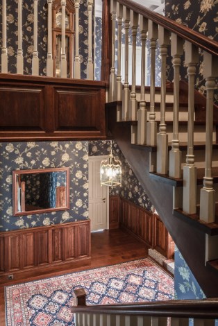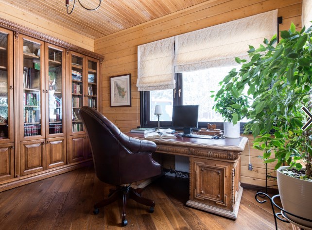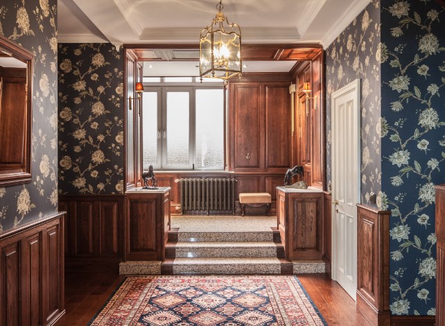 Отделка загородного деревянного дома вовсе не обязывает владельцев создавать полностью деревянный интерьер, особенно если хочется получить жилище в английском или американском стиле. Древесина прекрасно сочетается с бумагой, но это должны быть обои, не уступающие ей по глубине и харизме. Распространенный вариант разграничения: низ — деревянный, а верхняя часть комнаты отделана обоями в крупный растительный рисунок. На фото — мужская зона дома во Владимире, отделанная обоями из коллекции The Modern Gentleman американской марки с французскими корнями Chesapeake. Дерево — дуб янтарной окраски.