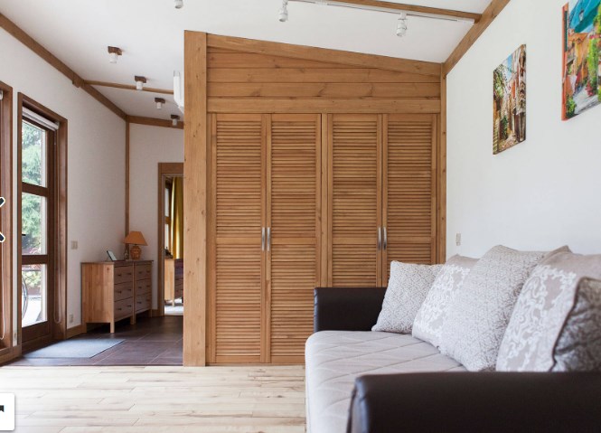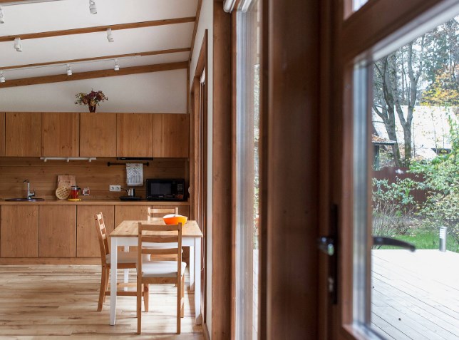Так як будинок за площею дорівнює невеликій міській квартирі, його внутрішній простір об'єднаний: праворуч - кухня-вітальня з диваном і вбудованою шафою за дверима-жалюзі. Навпроти зони передпокою — ванна кімната. Ліворуч від неї — двері до спальні. «Про особливість планування - ванна кімната з усіх боків « обгорнута » шафами, що покращує шумоізоляцію. У будинках малої площі це дуже важливе рішення, що дозволяє підвищити комфорт », – додає Дмитро. «Хоча ми обрали мінімальну площу будинку та мінімум витрат, тут є все, що потрібно двом. Коли до нас приїжджає син Діма з дітьми, вони мешкають у літньому будиночку на ділянці», — розповідає господар.