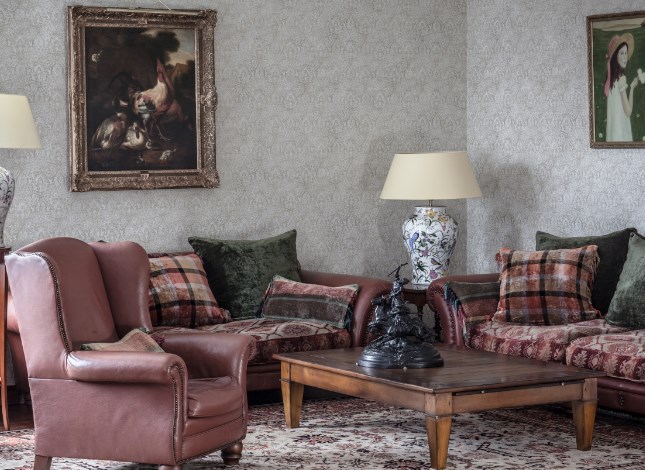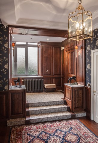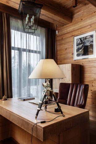 Оздоблення заміського дерев'яного будинку зовсім не зобов'язує власників створювати повністю дерев'яний інтер'єр, особливо якщо хочеться отримати житло в англійському або американському стилі. Деревина прекрасно поєднується з папером, але це мають бути шпалери, які не поступаються йому за глибиною і харизмою. Поширений варіант розмежування: низ - дерев'яний, а верхня частина кімнати оздоблена шпалерами у великий рослинний малюнок. На фото - чоловіча зона будинку у Володимирі, оздоблена шпалерами з колекції The Modern Gentleman американської марки з французьким корінням Chesapeake. Дерево - дуб бурштинового забарвлення.