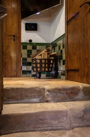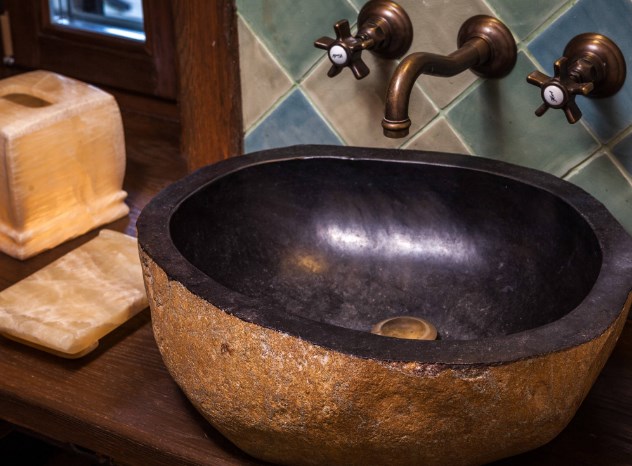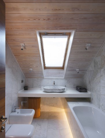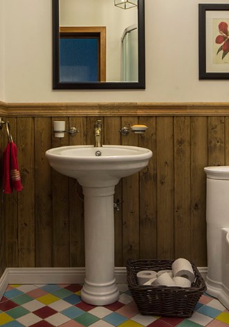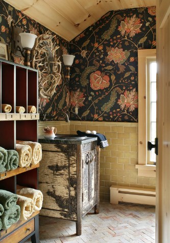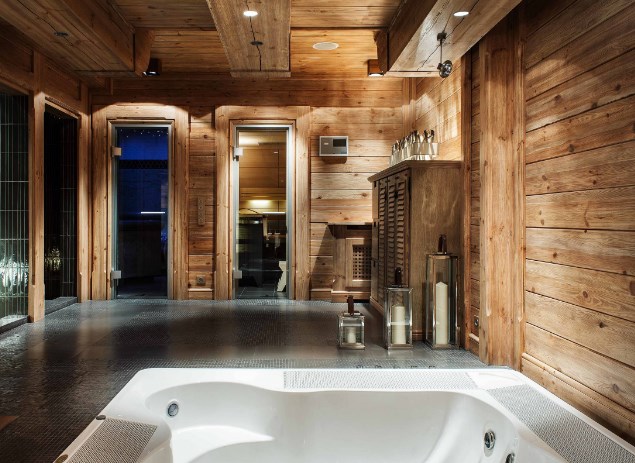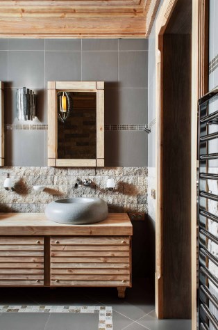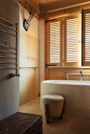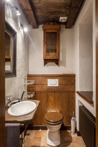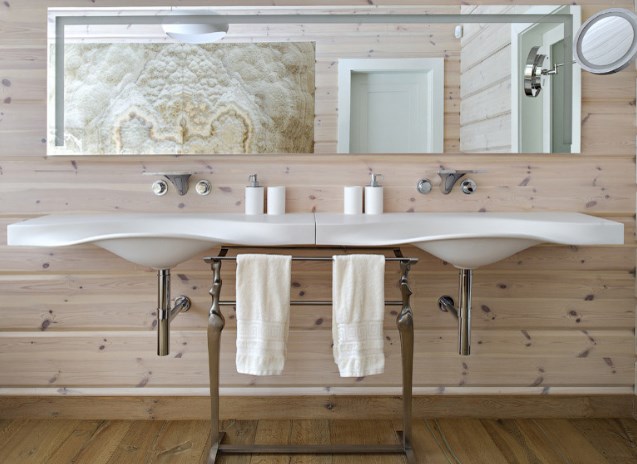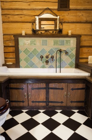 Оздоблення ванної в дерев'яному будинку (на фото) - особливе питання. Хтось боїться вогкості та грибка, відмовляючись від деревини на користь плитки, а хтось шукає якісні антисептики та лаки, щоб зберегти чарівність альпійської хатини (будиночка в стилі прованс або руської хати). Зверніть увагу, як оздоблено «екран» під чашею ванни. Брутальні дерев'яні дверцята з «кованими» петлями відкривають доступ до труб.