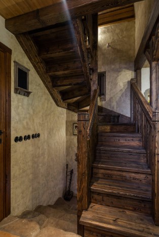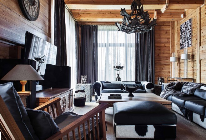 Базова формула стилю шале: дерево+камінь. Обидва ці компоненти не повинні створювати відчуття новобудови, тому камінь вибирають непомітних тонів, а деревину старять, морять, тонують і патинують. Яскраво забарвлених деталей в альпійському стилі ви не знайдете, всі відтінки тут приглушені, м'які. Урізноманітнити асортимент матеріалів можна за допомогою будь-яких натуральних «інгредієнтів» все тієї ж деревної гами. Це може бути чорний метал, льон, шкіра, роги тощо. Ті ж пуфи можна оббити бичачою шкурою - виглядати буде дорого і тепло (на вегетаріанців не діє).
