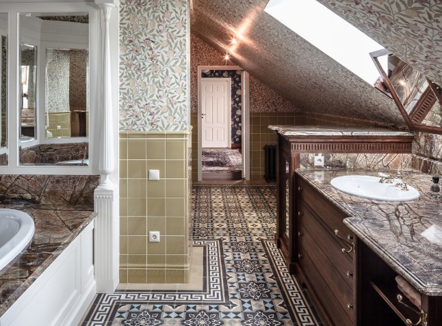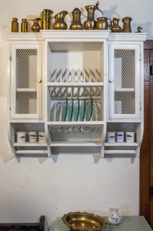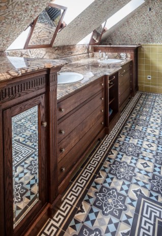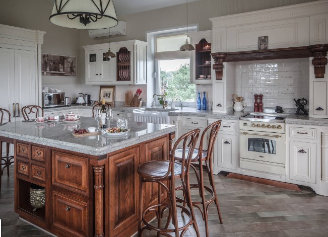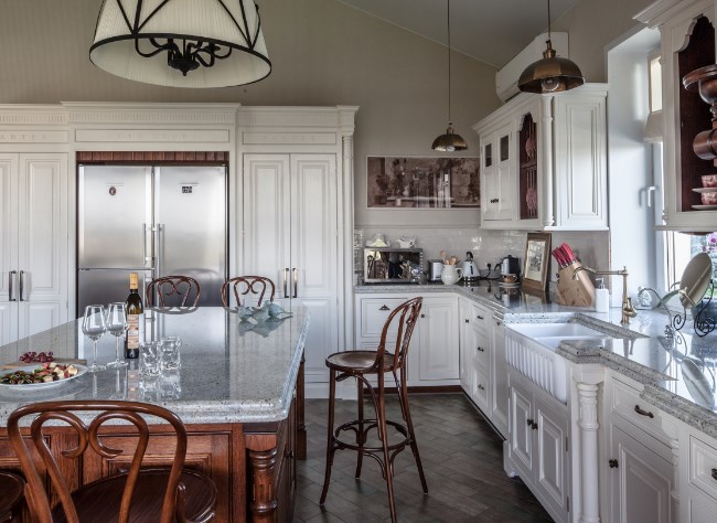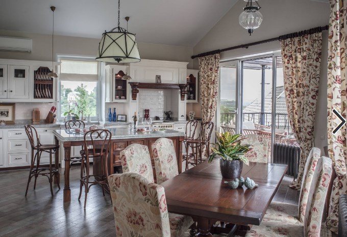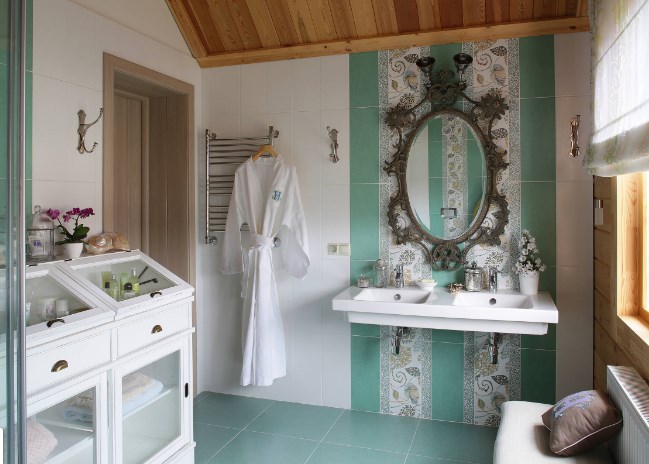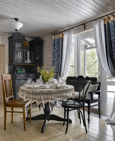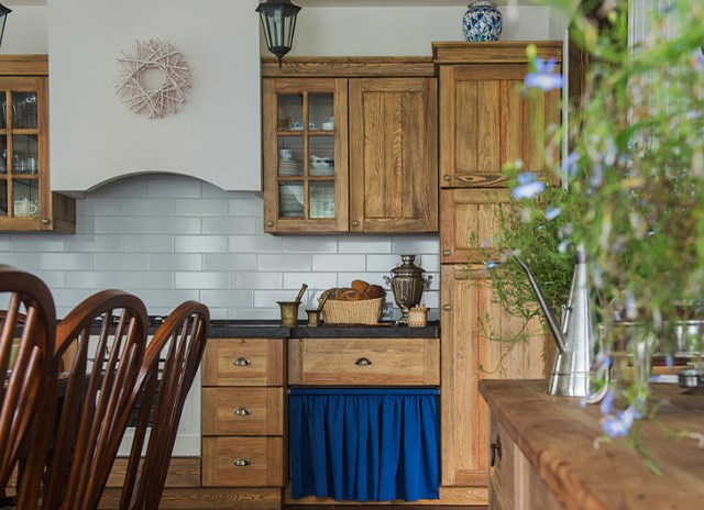 Щоб додати приміщенню світла та об'єму, одна зі стін у цьому проєкті оздоблена дзеркальними панелями. Зберегти ретро-стиль інтер'єру допомогла синьо-біла гжель на стиках. Для будинку в сучасному стилі цей прийом був би на межі кітчу, а в дерев'яному стіна з розписними тарілками має дуже органічний вигляд.