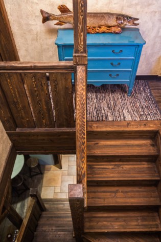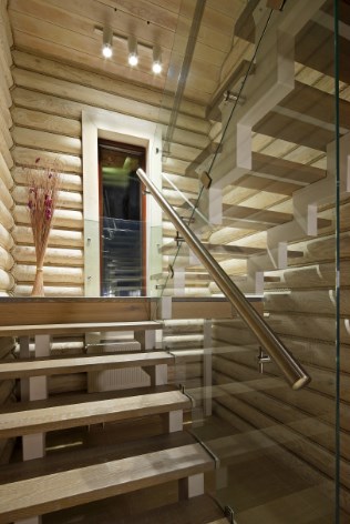 Ще одна типова проблема оздоблення дерев'яного будинку всередині - масивні глухі стіни. Особливо якщо вони мають конструктивну цінність. Тим більше - якщо йдеться про зруб. Найчастіше цю проблему вирішують за допомогою дзеркал, що створюють відчуття вікна. Але в цьому підмосковному будинку на Дмитровському шосе вирішили проблему інакше - вставили в стіну великий акваріум. Скло пропускає сонячне світло і візуально об'єднує вітальню з їдальнею. Важливо не забувати, що зруби мають властивість розширюватися і стискатися залежно від сезону. Тож закладайте для акваріума люфт. До речі, без віддзеркалень тут теж не обійшлося - у дзеркальних шафах під акваріумом захована техніка.