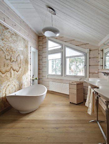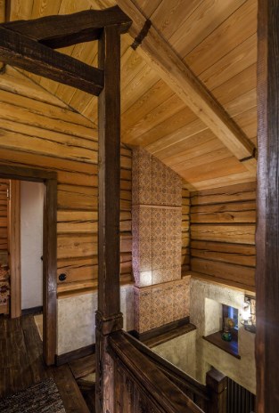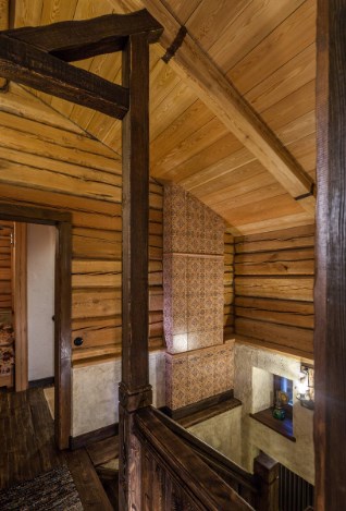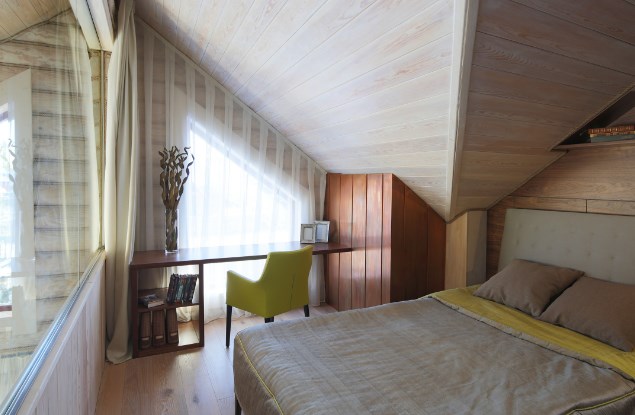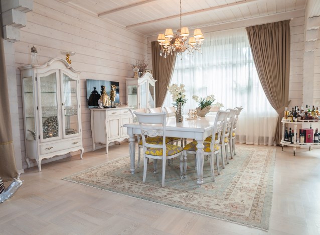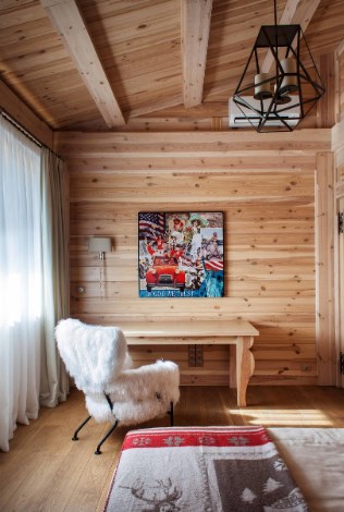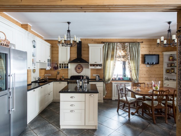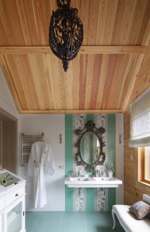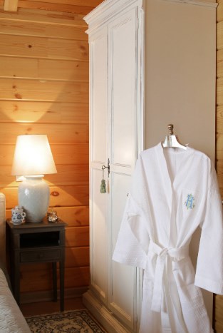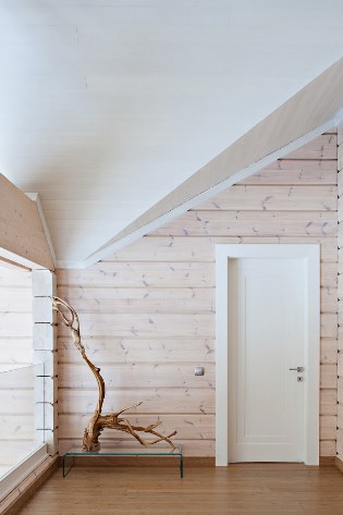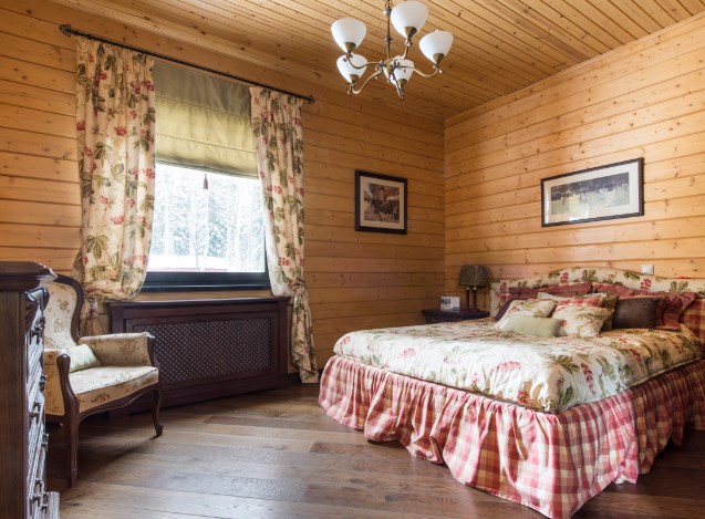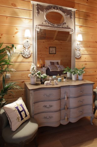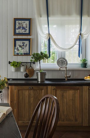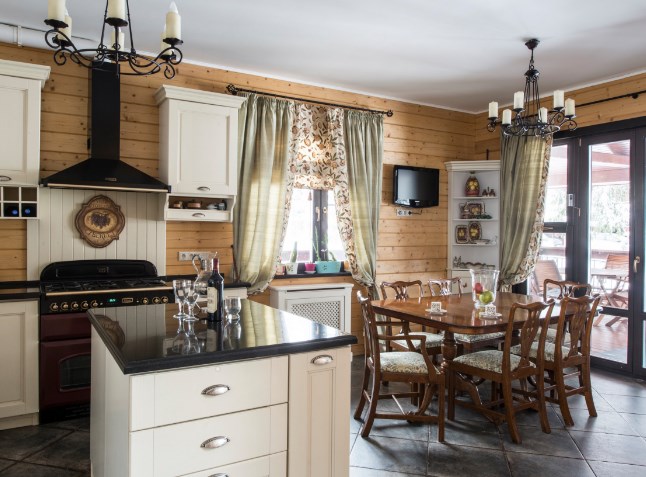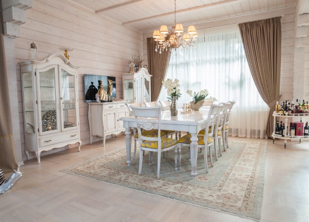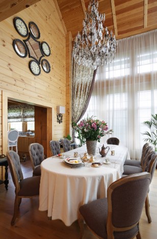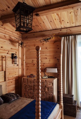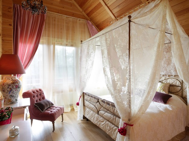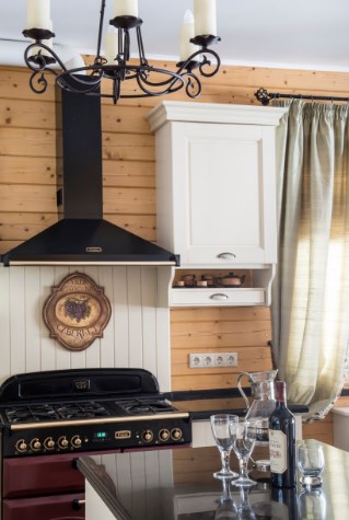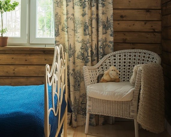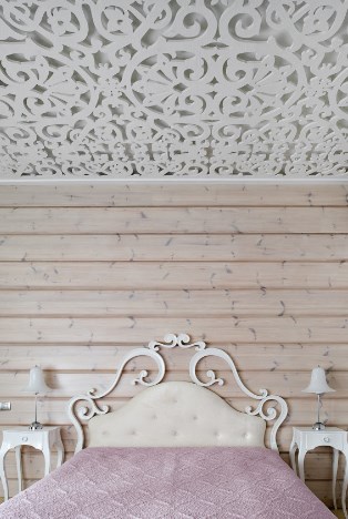 У цій оселі на Істрі господиня дуже хотіла зберегти колір і текстуру ангарської сосни, тому оздоблення стін дерев'яного будинку перетворилося на точкову роботу зі створення затишку. Світильники і свічники у вигляді пташиних кліток, плетені меблі, живі квіти і рослинні орнаменти натякають на французьке кантрі. А в спальні доньки масивність оздоблення дерев'яного будинку врівноважує повітряний балдахін над ліжком.