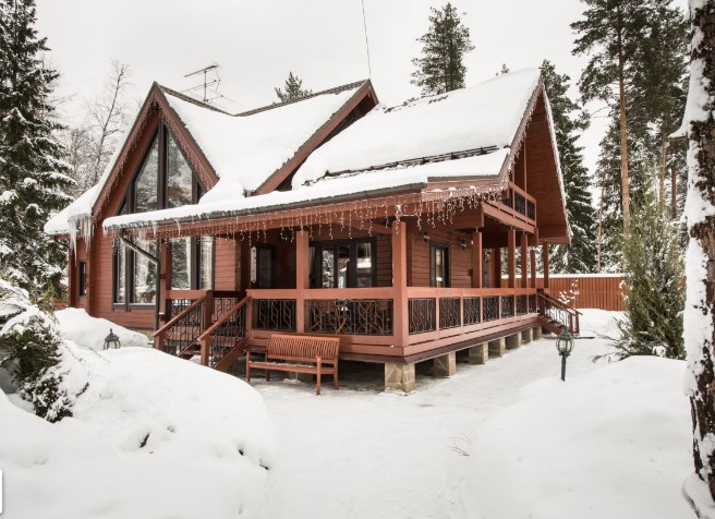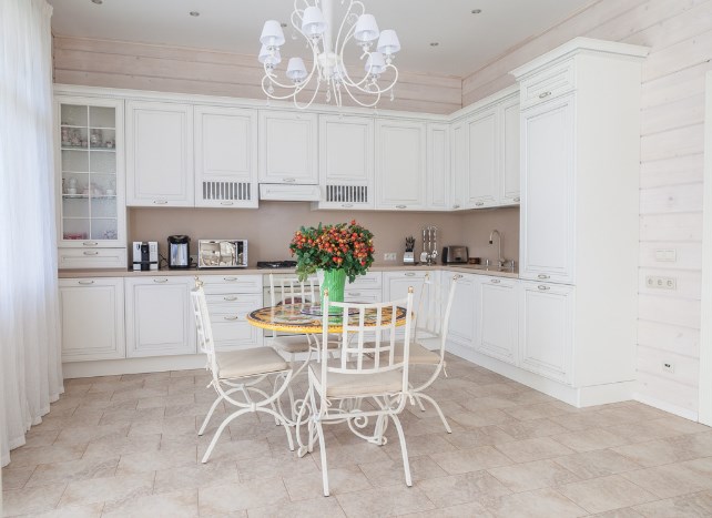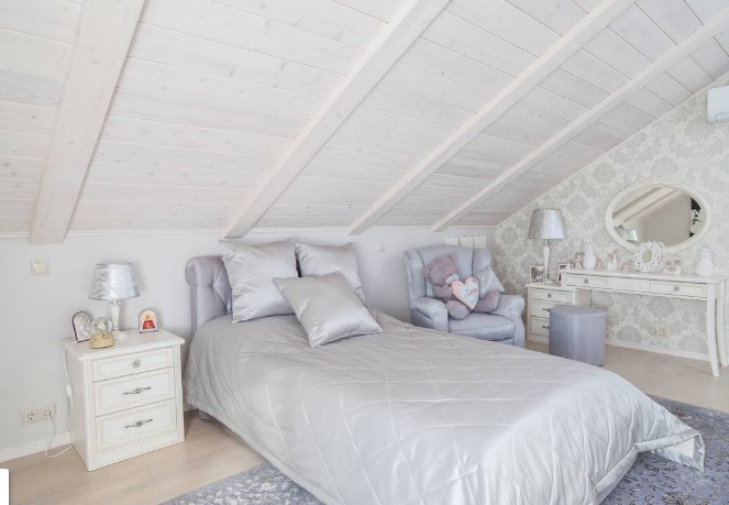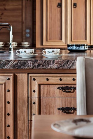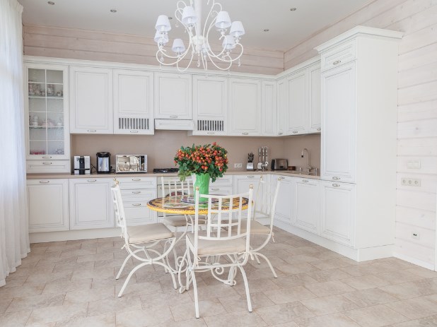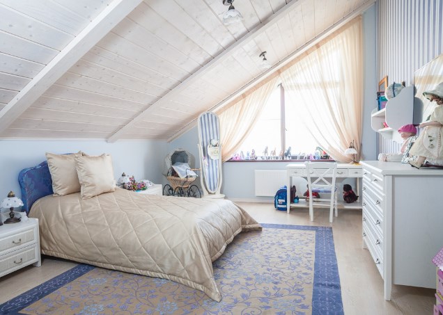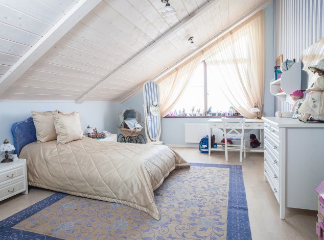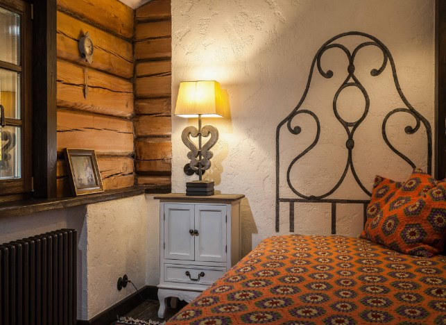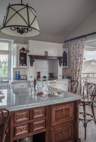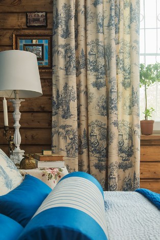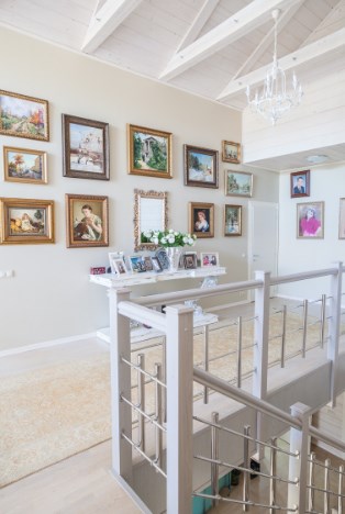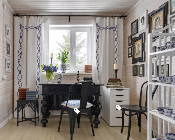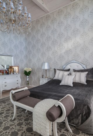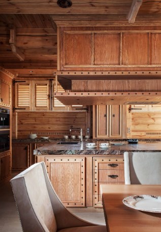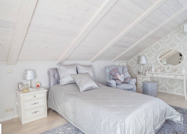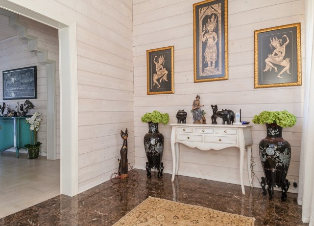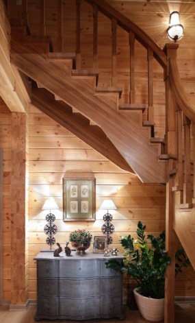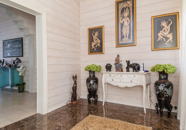 У цій оселі на Істрі господиня дуже хотіла зберегти колір і текстуру ангарської сосни, тому оздоблення стін дерев'яного будинку перетворилося на точкову роботу зі створення затишку. Світильники і свічники у вигляді пташиних кліток, плетені меблі, живі квіти і рослинні орнаменти натякають на французьке кантрі. А в спальні доньки масивність оздоблення дерев'яного будинку врівноважує повітряний балдахін над ліжком.