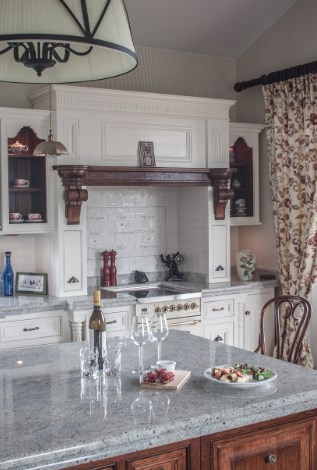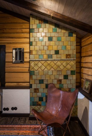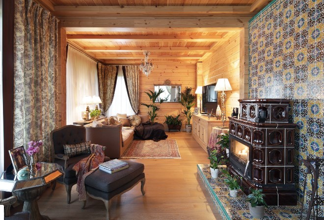 Оздоблення дерев'яного будинку своїми руками має зрозумілі обмеження: багато «квартирних» прийомів для декорування тут стають візуальним шумом. На щастя, є кахлі - те, що в тісній квартирі має занадто нав'язливий вигляд для оздоблення каміна, тут виявляється дуже доречним. Якщо ви хочете зробити вогнище композиційним центром приміщення, використовуйте кахлі або плитку під кахлі, як у цьому проєкті. Зону навколо каміна (і кухонний фартух) можна виділити майолікою з квітковим орнаментом.