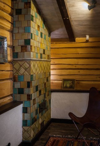 Одна з типових проблем у дерев'яному будинку - як заховати шахти вентиляції, щоб вони не псували інтер'єр. У цьому підмосковному проєкті їх оформили у вигляді фальш-печей, облицювавши плиткою під обливну кераміку. Дивлячись на чавунні пічні дверцята й ефектні «димарі», неможливо подумати, що це архітектурна хитрість, яка підтримує естетику шале.
