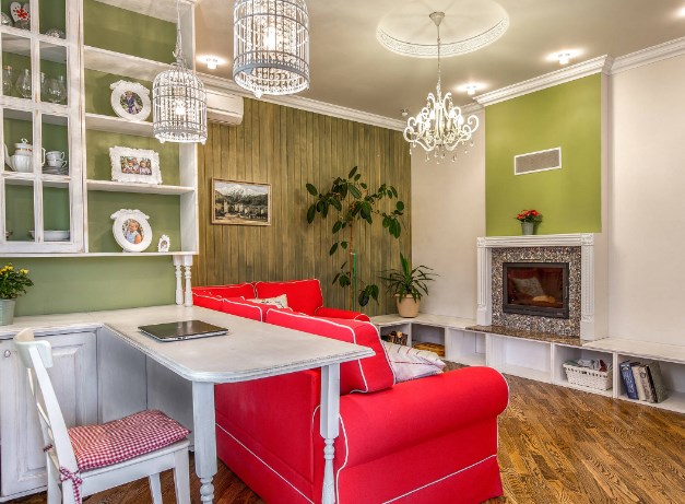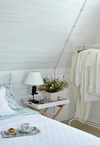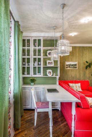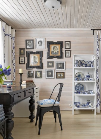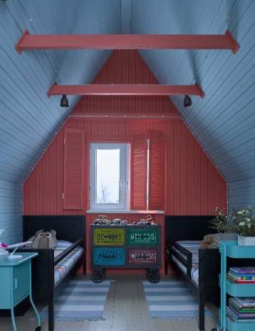 Якщо оздоблення дерев'яних стін виконано у світлій палітрі, акцентною деталлю може стати будь-який предмет меблів - наприклад, диван або шафа, як на цій старій віллі в передмісті Стокгольма. Господиня просто пошила відповідні чохли на ікеївські м'які меблі, а китайський буфет відтінку червоної іржі навіть не довелося перефарбовувати (хоча і це було б не складно).