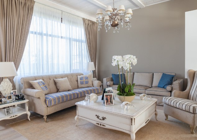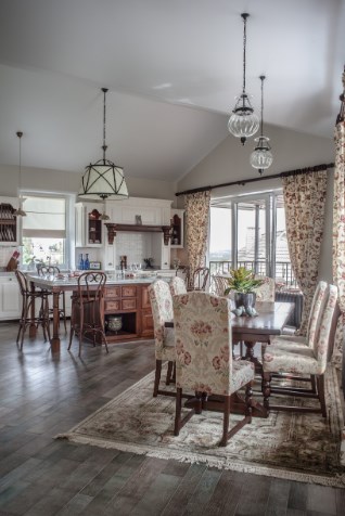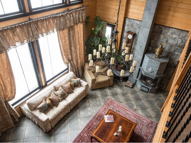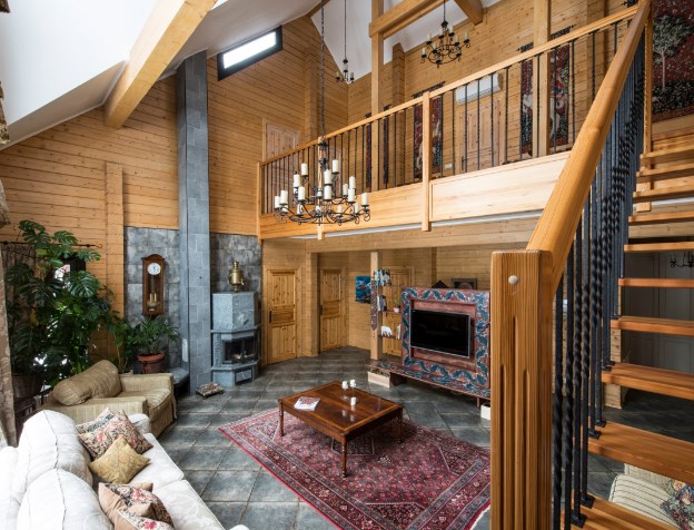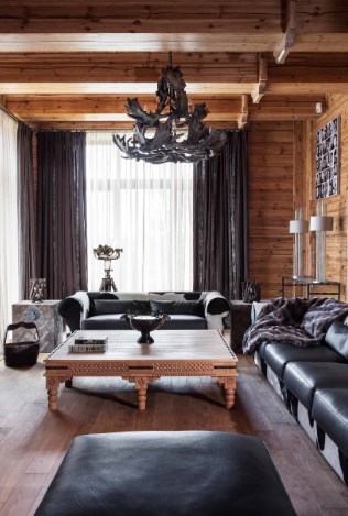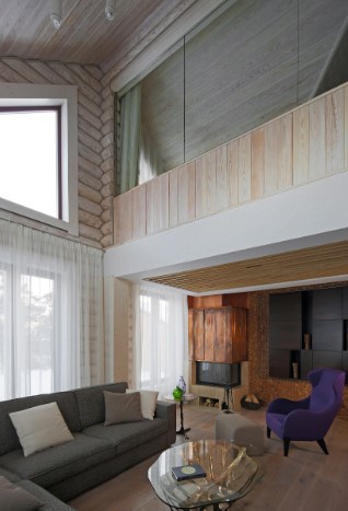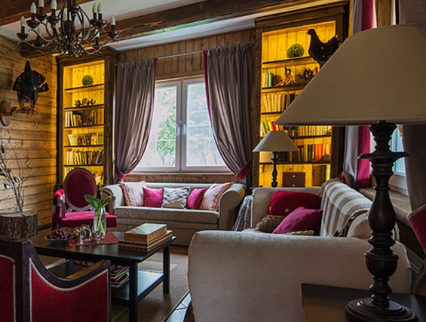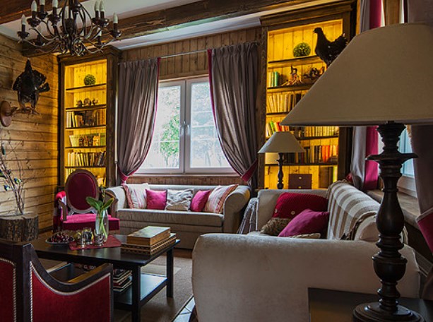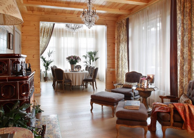 Вітальня в заміському будинку - місце тяжіння всього живого. Чим просторішою вона буде виглядати, тим краще. Якщо будинок невисокий, краще зробити центральну зону (хол, вітальню) під стелю, пожертвувавши частиною другого рівня, зате ви отримаєте об'єм і вдвічі більше світла від фасадних вікон. Ще більше витягнути приміщення допоможуть довгі, на два віконні прорізи відразу, штори. Хоча про висоту вітальні краще, звичайно, подумати не під час оздоблення свого дерев'яного будинку, а на стадії проектування.