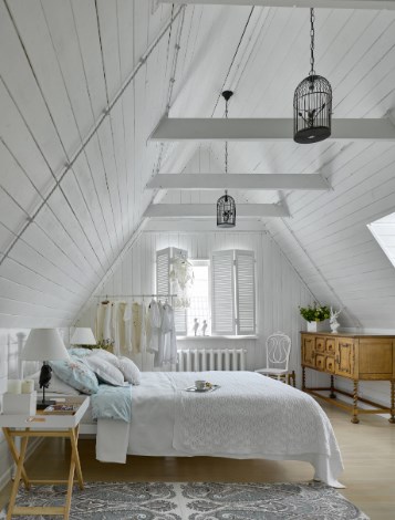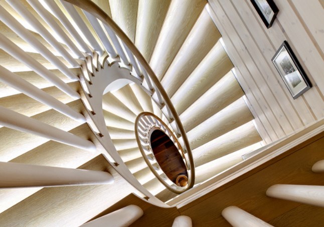 Оздоблення деревом усередині будинку не може не враховувати його габарити. Маленькі простори природний відтінок дерева може зробити ще тіснішими, тому його краще тонувати в напівпрозорий білий: так і деревний малюнок збережеться, і приміщення матиме просторіший вигляд. Вибілене тло дозволяє використовувати великі яскраві деталі, але краще, щоб акцентний колір був один, а деталей - небагато, інакше вони почнуть сперечатися між собою. У проєкті на фото такою деталлю стали зелені сходи, під якими зберігаються вінтажні валізи.