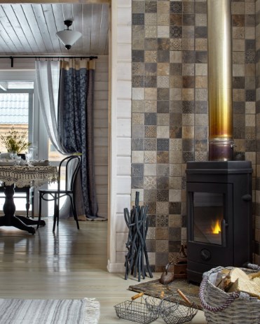 Якщо на кахлі та глазуровану кераміку немає ні коштів, ні сил, стіни в зоні каміна або грубки можна оформити керамогранітом у стилі печворк.