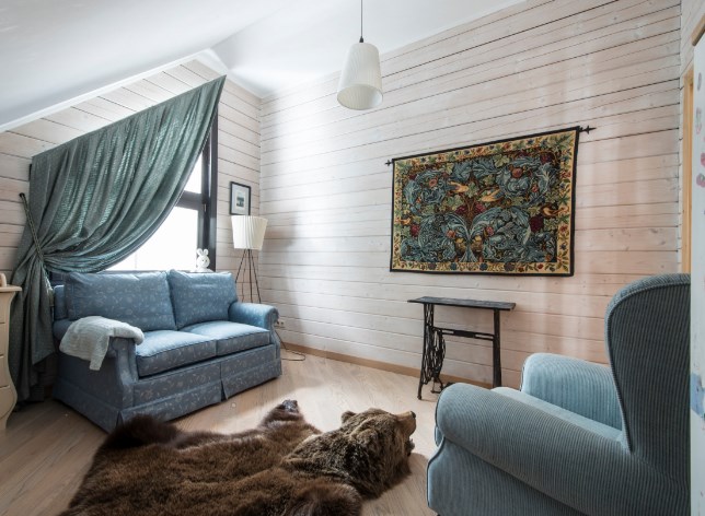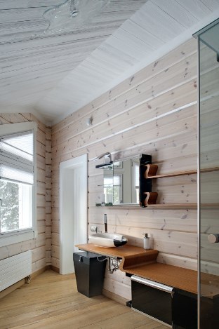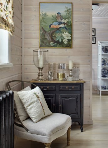 Для свого каркасника декораторка Анна Васильєва вибрала імітацію бруса. Оздоблення будинку деревом і зовні і всередині нагадує естетику фінських котеджів. Щоб підтримати стилістику скандинавського кантрі, фасади будівлі були пофарбовані у світло-сірий колір (білий з сірим змішували на місці, поки не потрапили в унісон із зовнішнім середовищем). А за оформлення дерев'яного будинку всередині (на фото) відповідають морений ялиновий брус, камінь, меблі з потертою фактурою і опудала птахів.