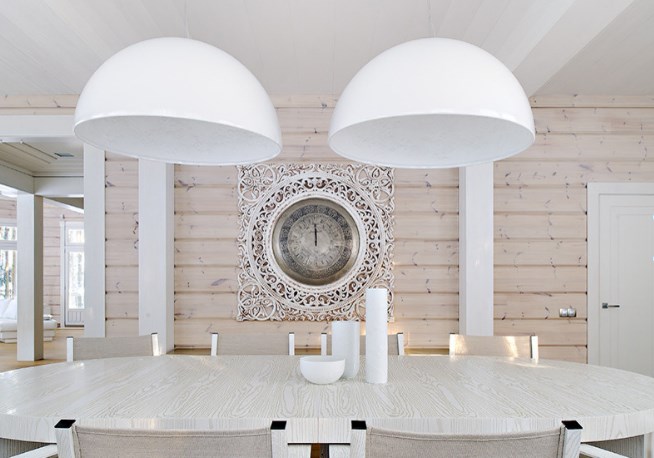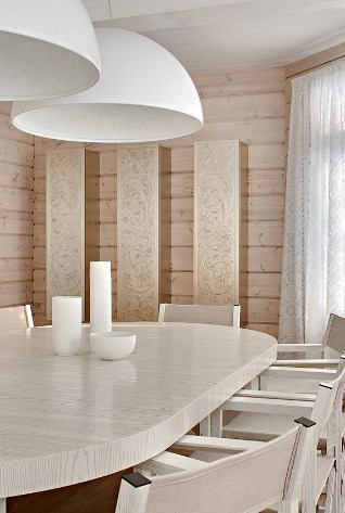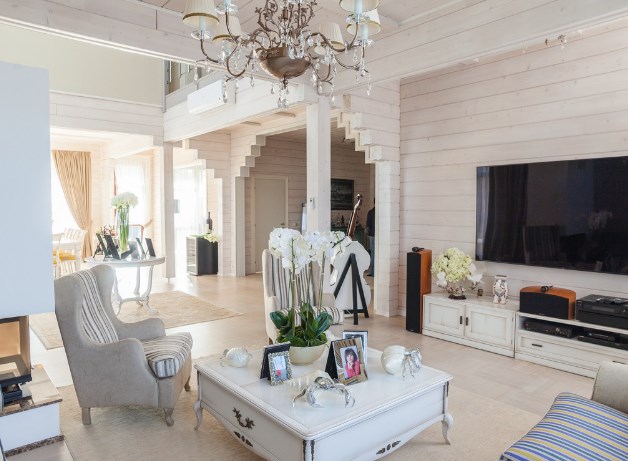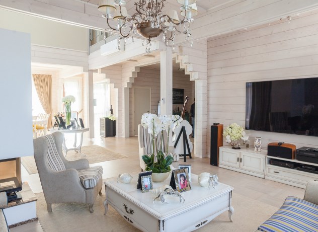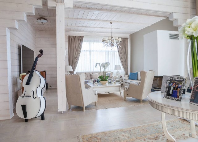 Дерев'яний будинок на фото належить родині з Красногорська. Господарям подобалася обшивка з натуральної деревини, але не вистачало витонченості та легкості в інтер'єрі. Тоді дизайнери запропонували доповнити деревну гаму у вітальні складними світлими відтінками (їх ще називають відтінками білого кольору) у меблях, текстилі та кахлях. Вершки, пряжене молоко, слонова кістка, арктичний сніг - всі ці відтінки прекрасно уживаються з дерев'яними стінами, роблячи інтер'єр легшим. Та й сучаснішим, чого вже там.