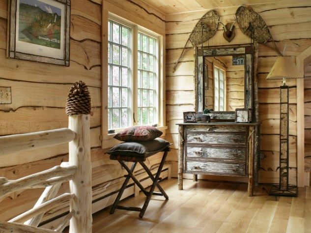 В інтер'єрі заміського будинку дерев'яного декору може бути багато, оскільки він відповідає загальній еко-стилістиці. Шишки, корчі, прути, пеньки - в ідеалі у кожного предмета має бути своє призначення. Так, у цьому американському будинку старий дерев'яний човен став шафою і головною родзинкою вітальні в рустикальному стилі. Контраст «білий сосновий фон - темний морений декор» завжди успішно працює.