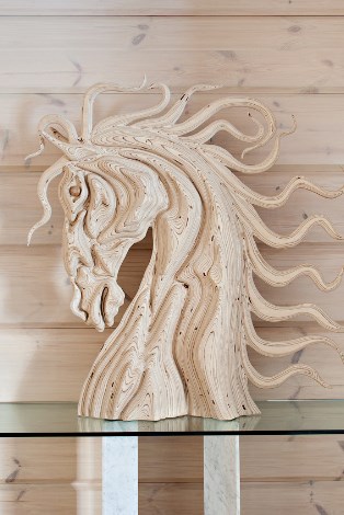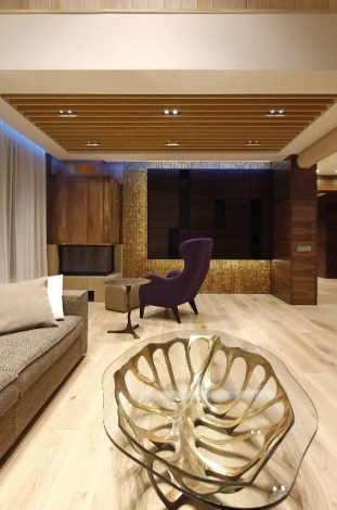 У дерев'яній обстановці органічно виглядають меблі біонічних природних форм. Принадність такого столу, як на фото, ще й у його легкості: скляна стільниця не приховує декоративної основи і не перевантажує інтер'єр.