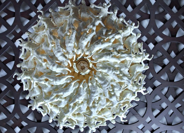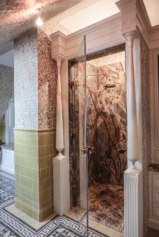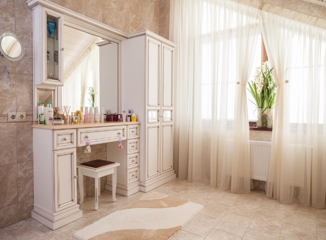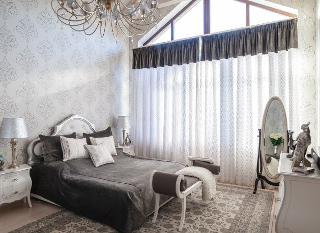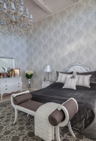 Якщо інтер'єр не хочеться перевантажувати яскравими деталями і важливо зберегти «відчуття шепоту», можна використати об'ємний декор у тій самій колірній гамі, що й стіна, - наприклад, ажурне різьблення. Мереживна рама на фото обрамляє великий годинник. У цьому ж проєкті кабінет і спальню прикрашають різьблені стелі.