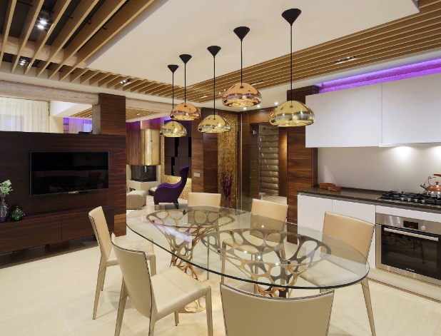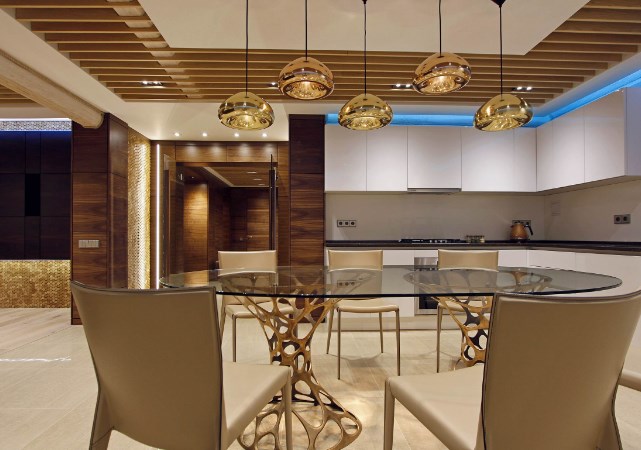 Щоб не занижувати стелі, замість гіпсокартону є сенс використовувати рейкову обрешітку. Проводку можна пустити в пазах, а світильники вбудувати між підвісними рейками. Виглядає така стеля не тільки симпатично, а й об'ємно. У цьому проекті використані 10-сантиметрові рейки.