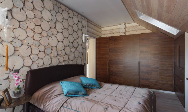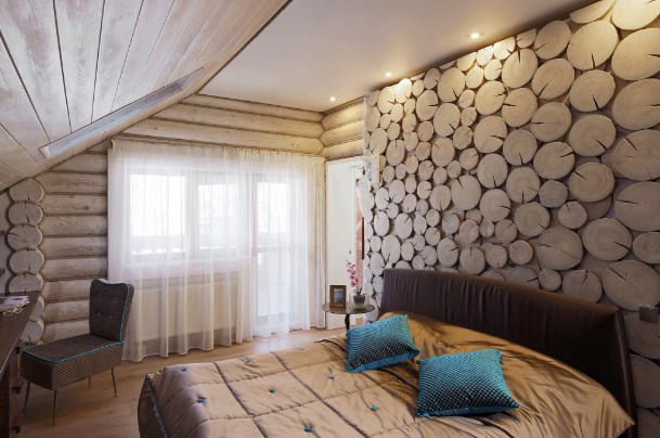 Винні пробки - ще один підходящий матеріал для оздоблення стіни дерев'яного будинку. Ріжте кожну пробку на дві половинки і обклеюйте ними виділений простінок. Так ваша колекція опиниться у всіх на очах, а кімната отримає додаткову порцію тепла і об'єму.