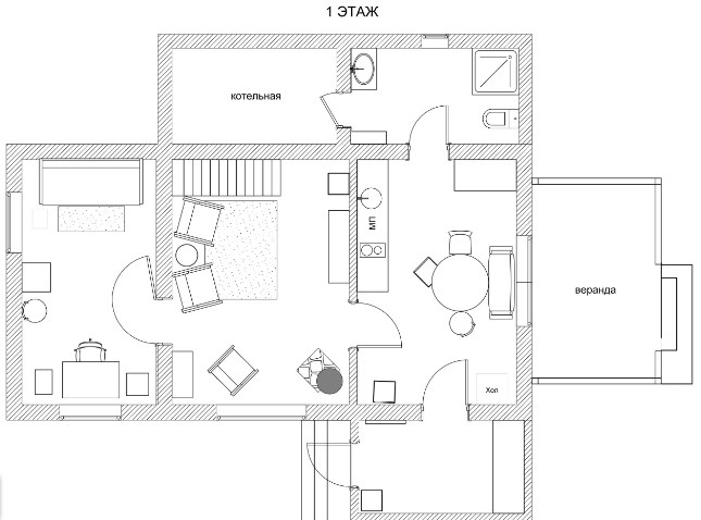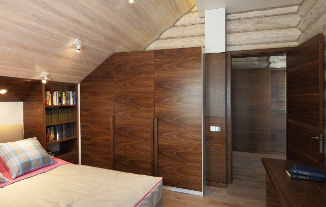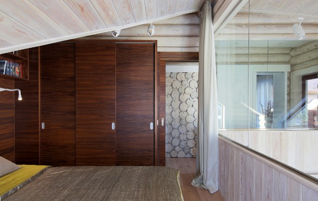 Господарів цього будинку в Підмосков'ї не особливо зачарувала естетика хати, тож вони сховали (де змогли) оциліндровану колоду за гладкими панелями з дерев'яним малюнком. Хитрість у тому, що це не просто панелі, а повноцінні шафи на пушап-системі (натиснув-відкрив): там заховані не тільки дроти і труби, а й маса домашніх речей.