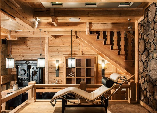 Якщо ви вже розглядаєте цю симпатичну кушетку, репліку розкрученої моделі Ле Корбюзьє, то, щоб уникнути заздрощів, не дивіться вище - над кріслом розташований стельовий солярій на дистанційному управлінні. Дивіться праворуч - там демонструється цікавий спосіб оздоблення дерев'яного будинку всередині своїми руками. Стіна прикрашена спилами колод: дуже просто, і при тому ефектно.