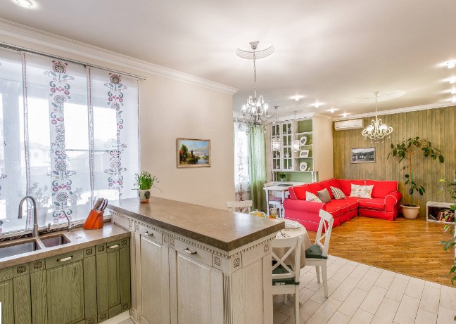 Наприклад, вагонка для створення сучасного інтер'єру годиться гірше, ніж фанера або ОСП. Зате з її допомогою найпростіше створити легку дачну атмосферу і витягнути приміщення в довжину або висоту залежно від напрямку дошки. Так, у проєкті на фото трав'янистий колір одразу занурює в літо кухню-вітальню самарського будинку і робить стелі вищими.